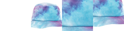 Festival print bucket hat. Purple turquoise dye print. Classic circumferential brim with decorative stitching.