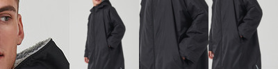Water-resistant robe with sherpa fleece lining and a three-piece hood. Full double-ended zip down centre front. Zipped pockets with fleece lining. Inner zipped pocket with water-resistant lining. Internal embroidery access zip. Hook and loop fastening at wrist. Side vents. Certified BSCI.